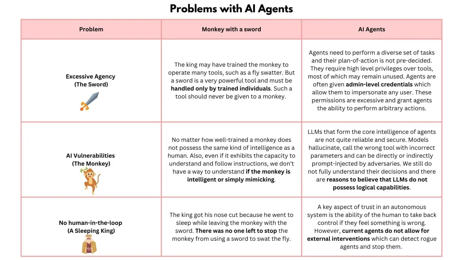 This increase in autonomous capabilities is not free of risks. Agents need access to powerful tools such as emails, payments or customer data and may even be present in browsers/computers. But agents are relatively new and often make mistakes. Providing AI agents unchecked access to such tools without compensating controls and supervision can lead to serious harm. The combination of unexplainable AI with powerful tools has many similarities to the monkey with a sword story.